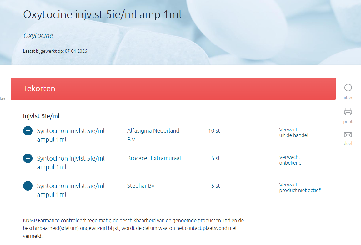 Op de website van KNMP wordt sinds vandaag (07-04) geen datum meer weergegeven waarop Syntocinon verwacht wordt (zie afbeelding 1.1). Wij vinden het heel vervelend om te melden dat wij geen zekerheid kunnen bieden wanneer het product weer leverbaar wordt. U kunt zich via het formulier hieronder aanmelden om op de hoogte te blijven en actief bericht te krijgen op het moment dat het weer leverbaar is.
